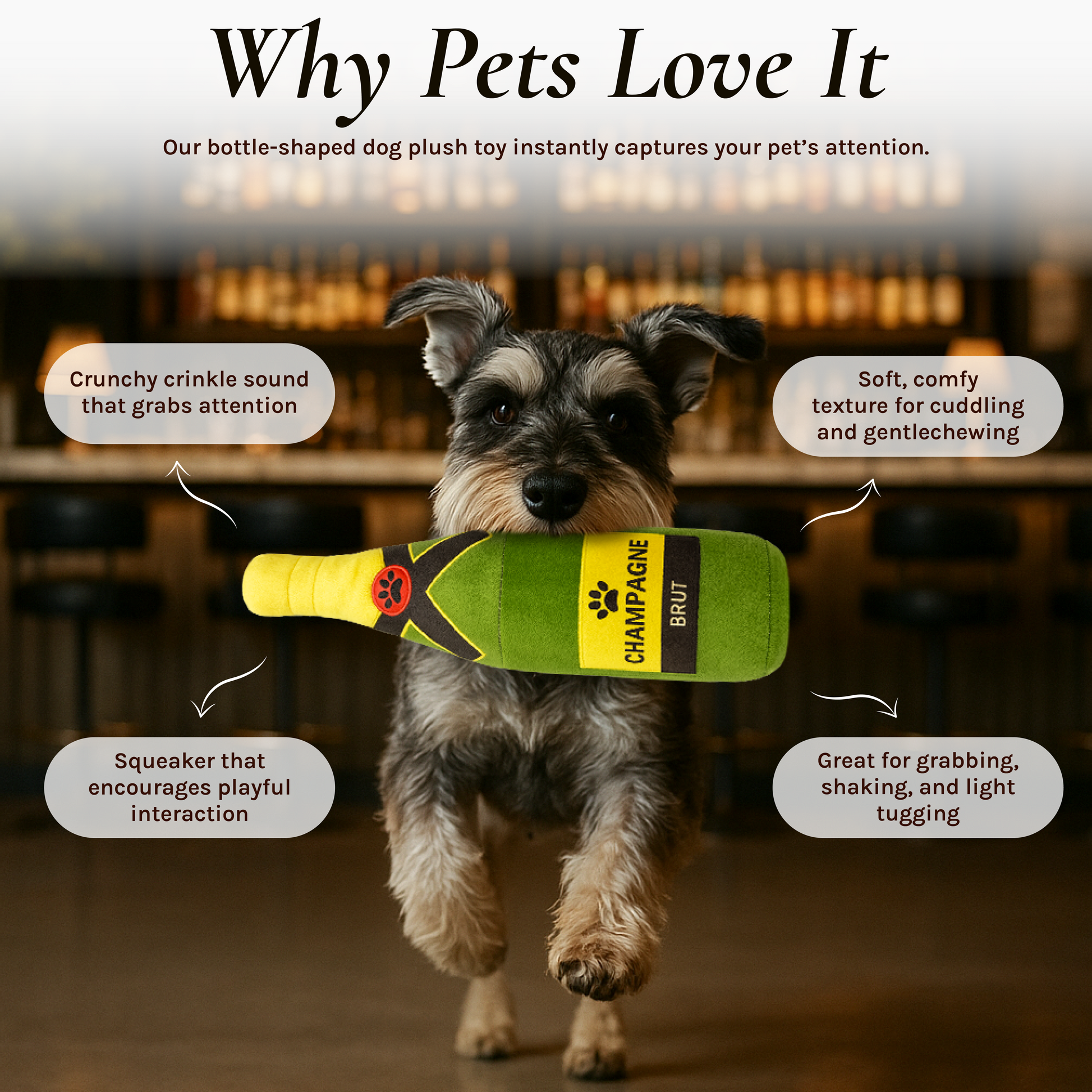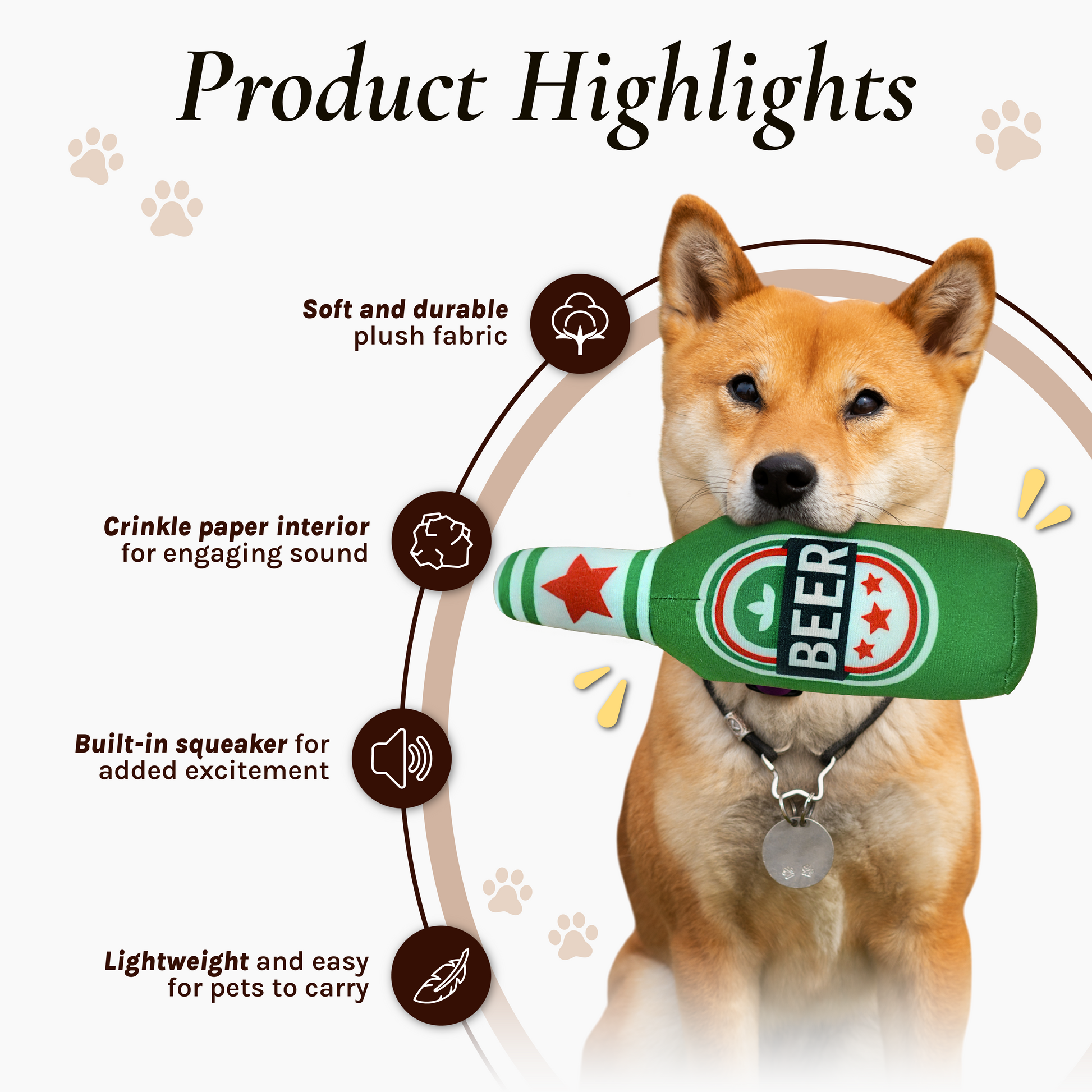 This bottle themed plush toy brings playful fun to dogs who love soft squeaky toys. The design captures the look of classic drink bottles and adds a humorous twist for pet parents who want something unique. Made with durable stitching and a soft body that is perfect for fetch and cuddling. A great choice for dogs of all sizes who enjoy lively indoor play.